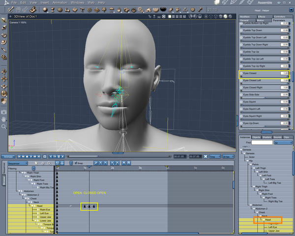 If you set a key frame with the eyes open then drag the time line along a few seconds then set a key frame with the eyes closed. Normaly this would close the eyes over the few seconds, this is bacause usually the tweener is set by default to linear.
