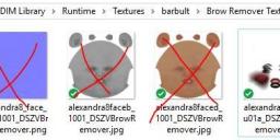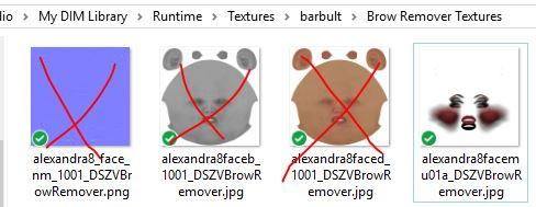 I'll try this after my current render finishes, but I am skeptical. I can see that the saved texture file created by Brow Remover looks wrong. I put the red Xs on the texture file thumbnails, because I don't think I'm allowed to post product textures in the forum. Hopefully these little thumbnails are good enough for you to see the issue with the saved texture file. maybe I did something wrong, so I'll restart Daz Studio and do it all again from scratch.
