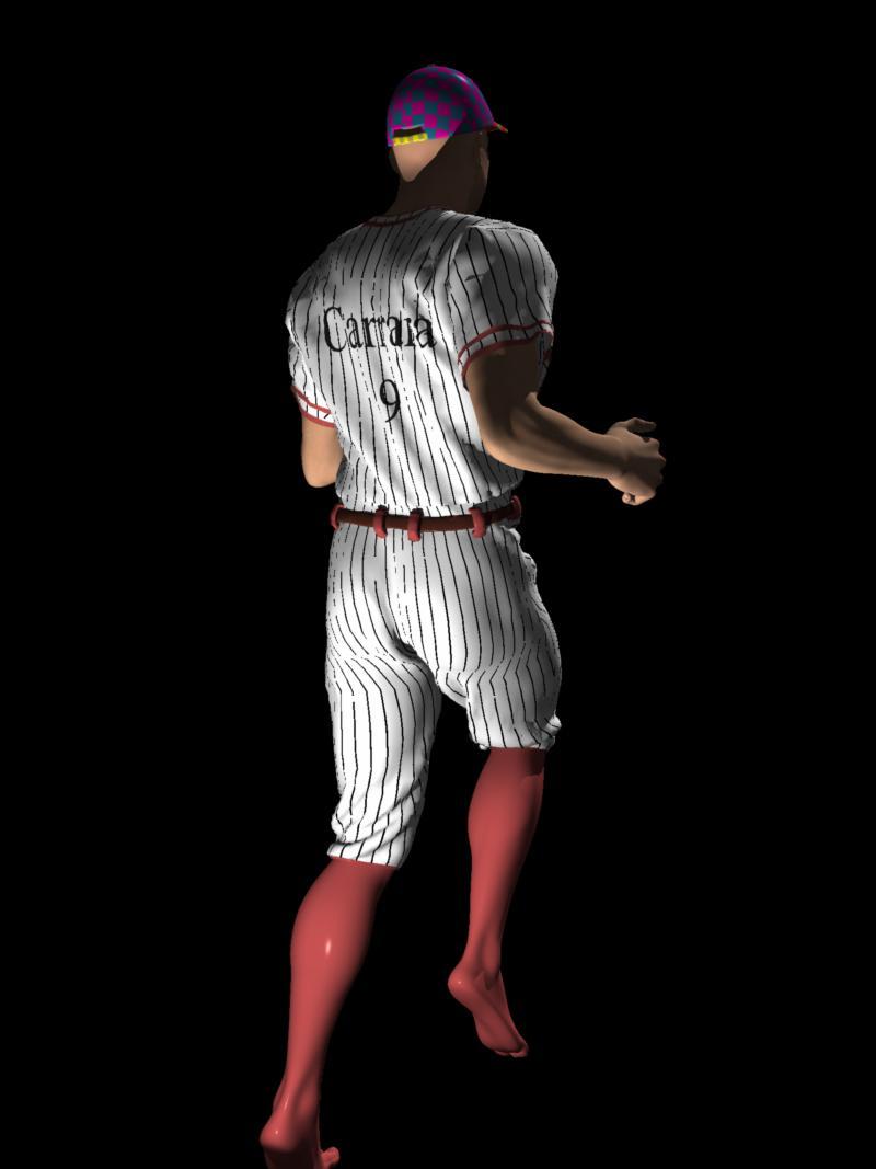Frustration level is declining. I love, absolutely love, the way the uniform is folding when I get the VWD plugin working with Carrara. Still struggling with finding the workflow that will allow me to get the whole scene assembled, as opposed to just the figure. But don't you like the way the belt held firm and the shirt folded with the slightly twisted torso? Also, the elastic held just below the knee and the pantlegs folded. Look at the folds in the back with the letters. I chose the pinstripes because (a) common in baseball uniforms and (b) help show off the VWD drape.