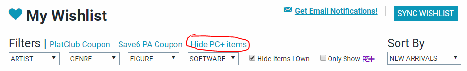 I'm sorry Ati, I spaced on that being on the WL page. Is there any chance of getting that link on the main store page as well? The PlatClub link removes the PC+ items, but it also removes the NEW DOs as well which are eligible for the PlatClub coupon, and which are sometimes among the best discounted items. Thank you.