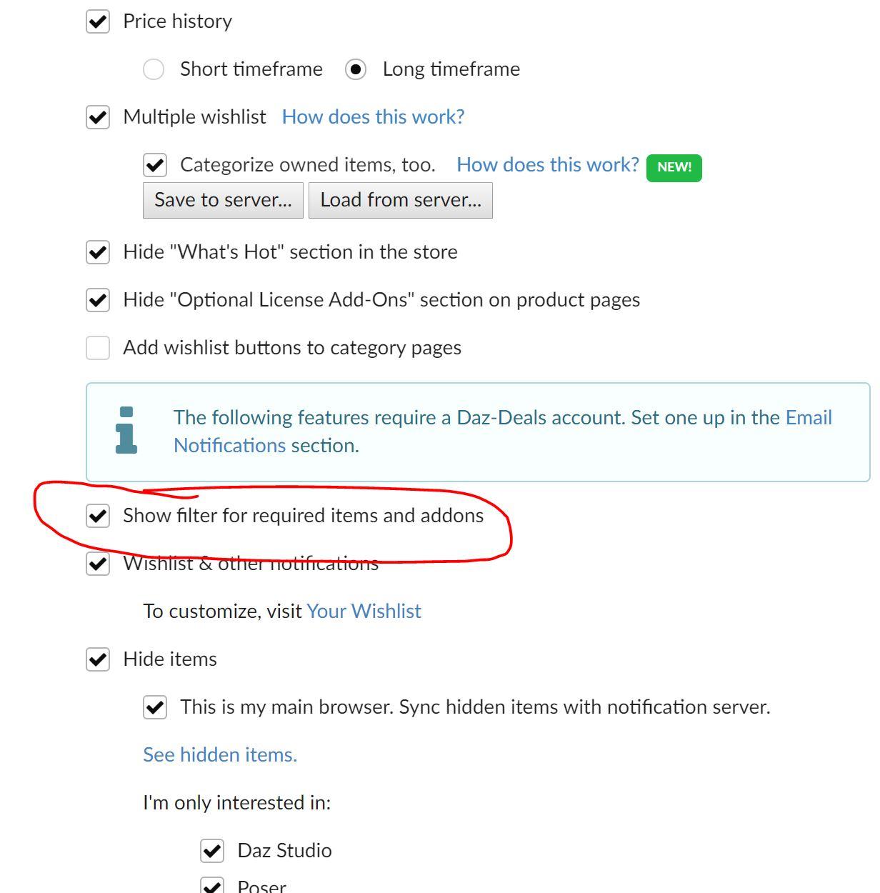I don't seem to have that Show filter for requiered items and addons option in my Deals Browser Options.