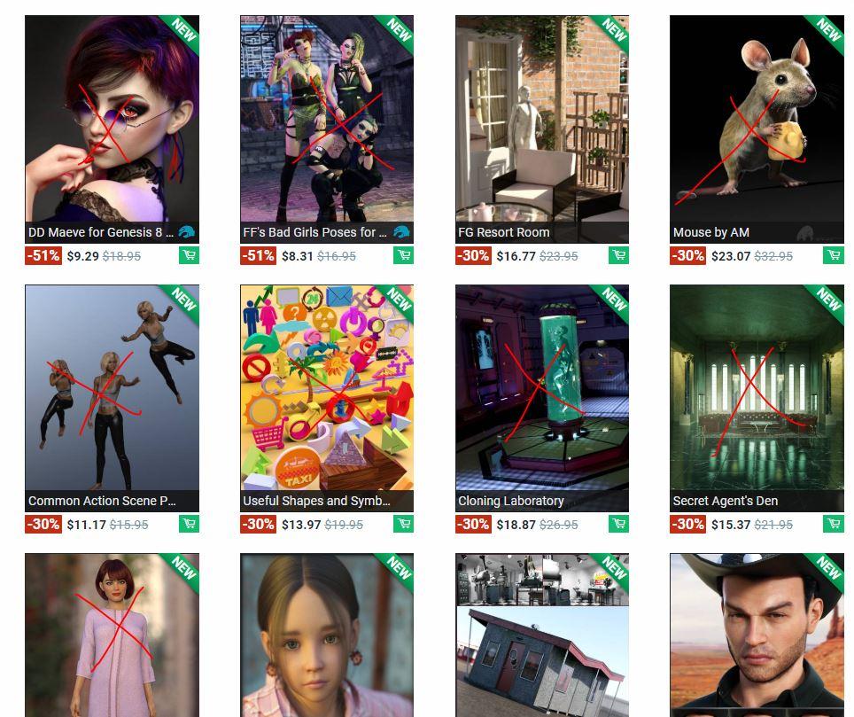 All of those show up fine for me, too, and I have several things, Vue, Carrara, and Bryce suppressed in my Daz Deals options..