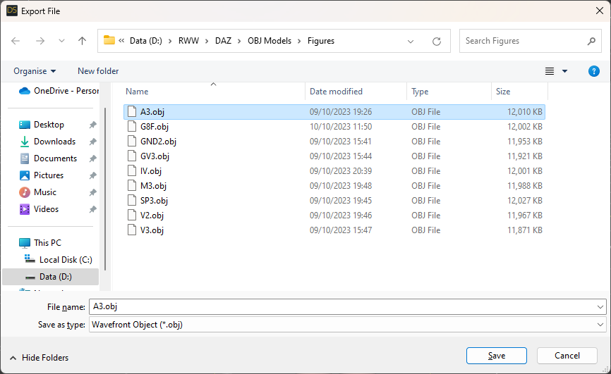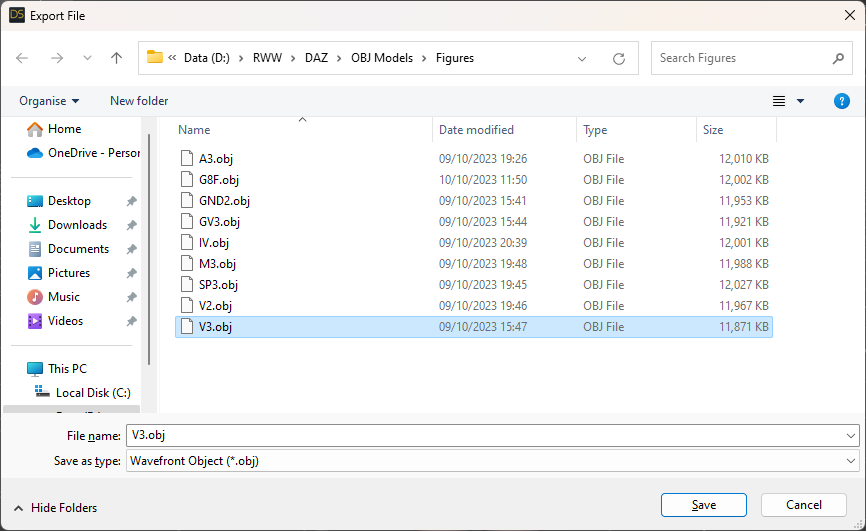 The save dialogue opens, choose any temporary directory you want. Save under the Name ‘V3’.obj