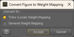 Yep, that's what I thought too. But DS4.21 (not tried with earlier) converts the parametric characters to Triax Weight Mapping using menu option 'Edit| Figure| Rigging| Convert to Weight Mapping' and then select Triax Weight Mapping in the mini window that opens up.