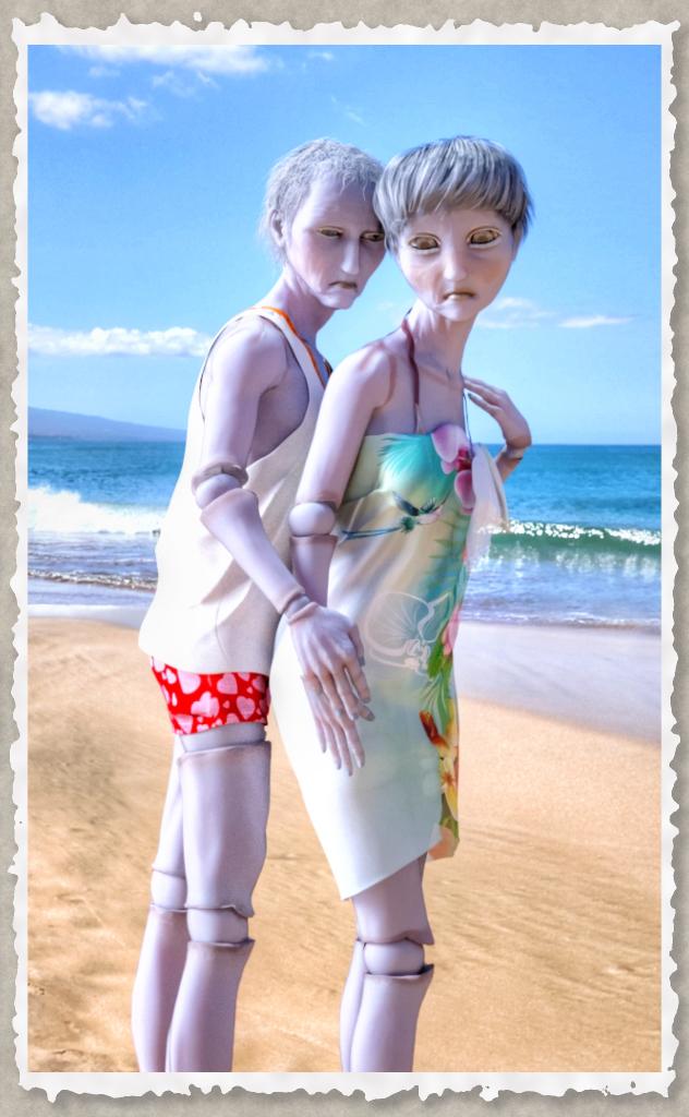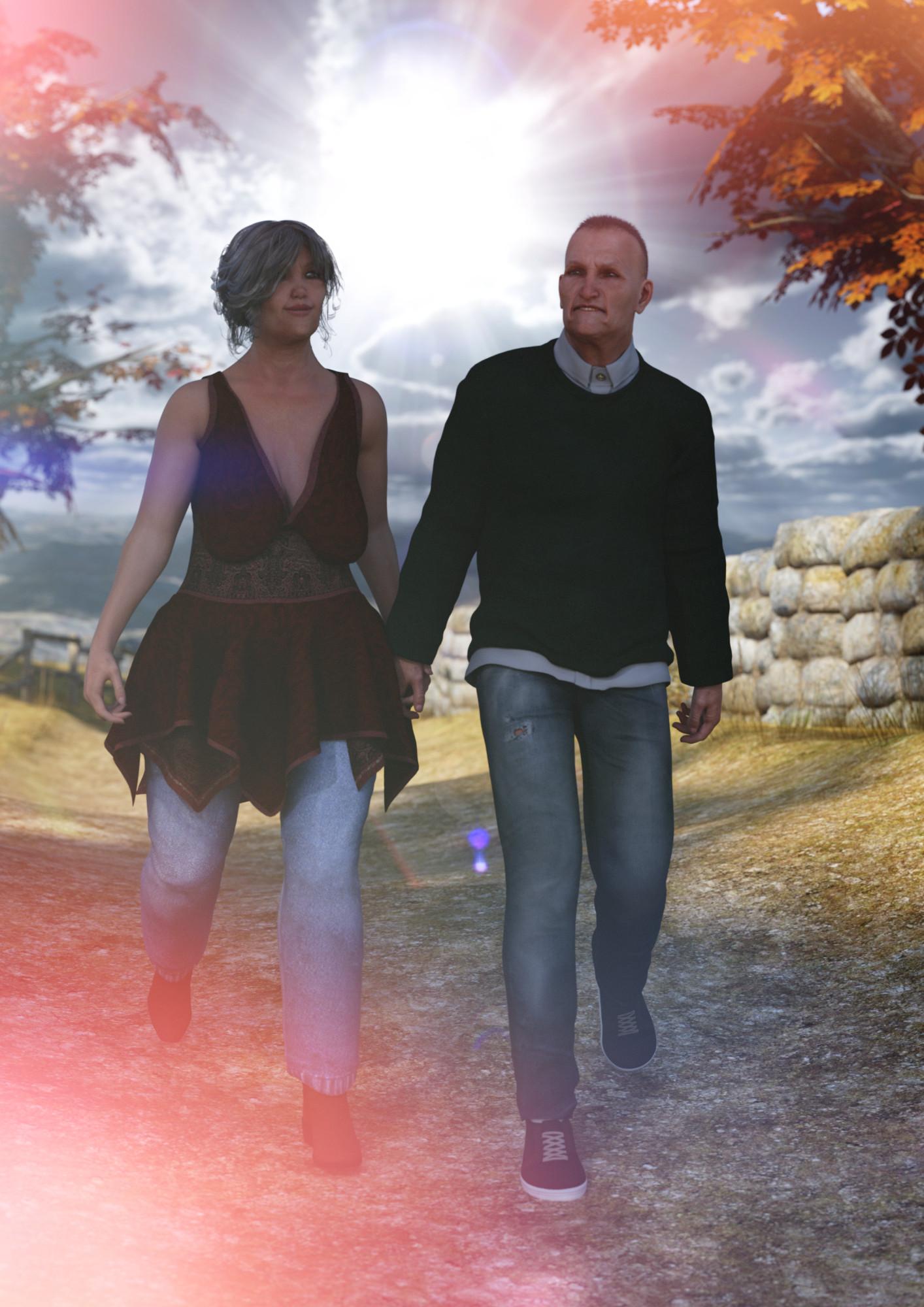 I used Opal for Genesis 3 skin on both the male and the female with some slight surface adjustments to make each look more unique. Both figures are dial spun. Aging morphs on both figures. Rendered in Iray. Post in GIMP.