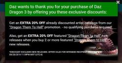 My confusion is the line "Get an EXTRA 20% OFF already discounted artist catalogs from our "Dragon Them To Hell" promotion. - no qualifying purchase required. "