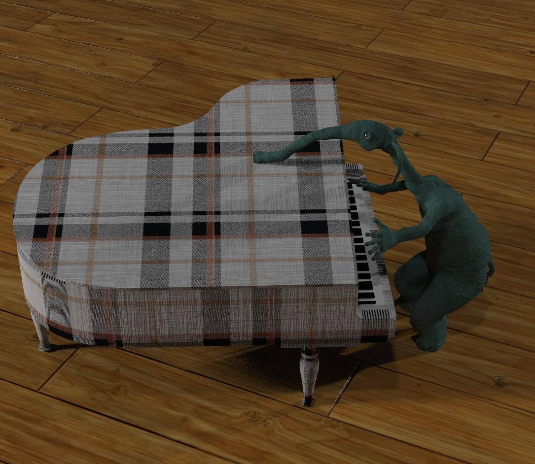Below is my attempt, with wood shader on the floor and textile shader on the piano.