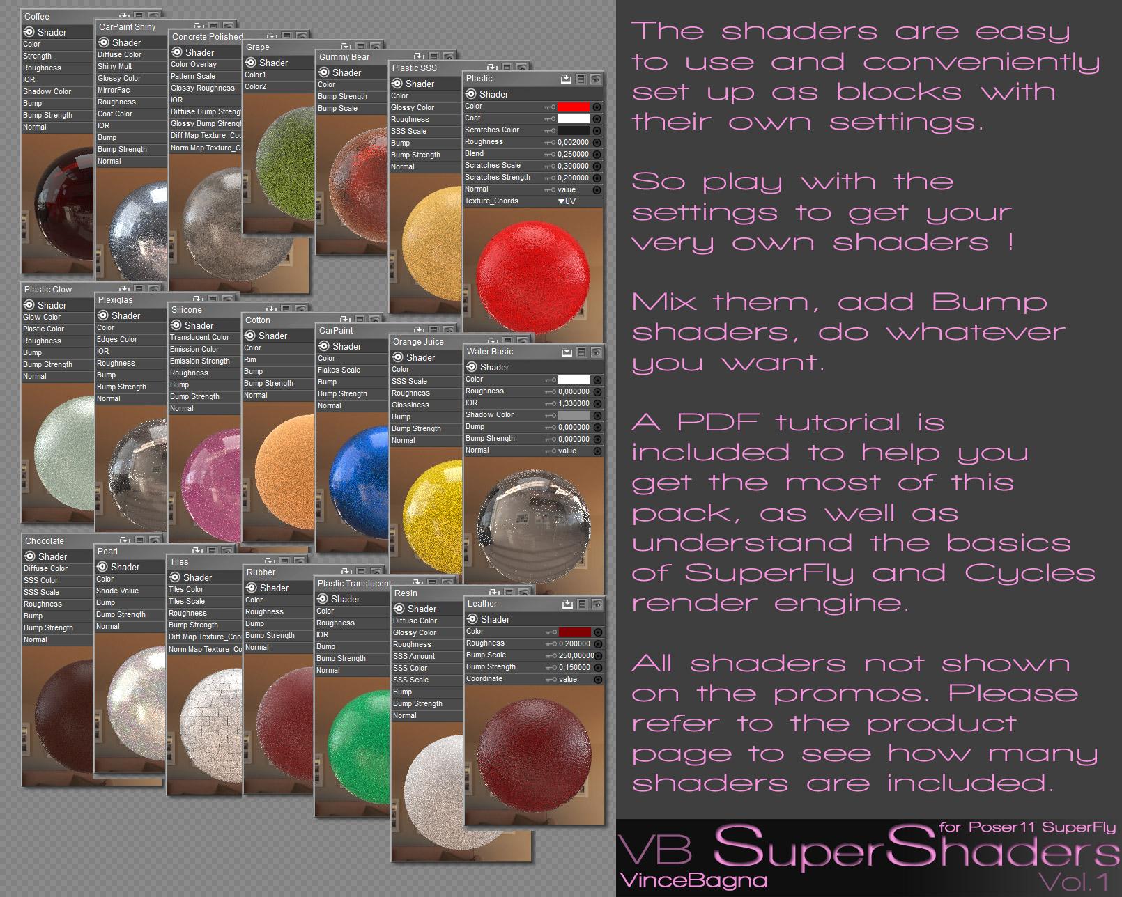Soon will be released VB SuperShaders for Poser11 SuperFly Vol.1 with more than160 shaders going through these categories :
