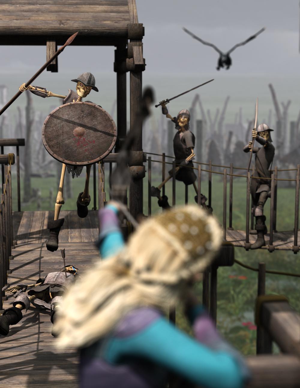I changed the blood spatter color and opacity on the charging skeleton's shield, so hopefully it looks more muted. I also added a dragon in the distance coming to the elf's rescue.