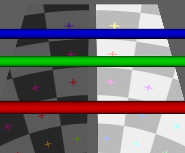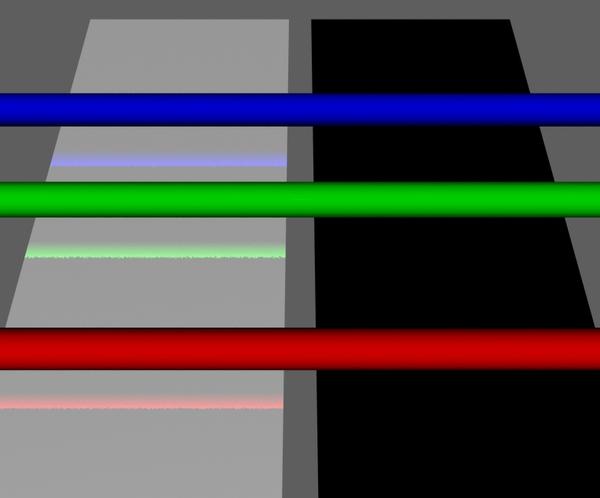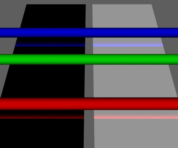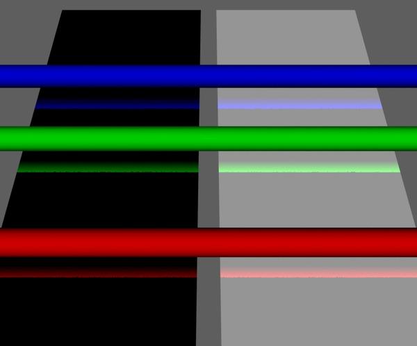 You still see a hint of the diffuse color (left plane is still black, right plane still white), so the 100% reflection strength seems to be almost working as I'd expect. But we've lost the raytraced reflections of the three rods. Iirc the reflection parameters on the basic UI Parameters tab make Ray-traced reflections and Environment mapped reflections mutually exclusive on a single surface.