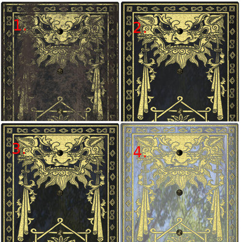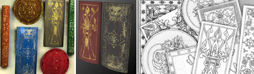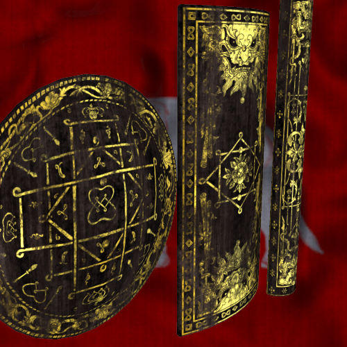 There are two new designs for each of the three shields, and there's a 'new' and 'worn' version of each as usual. They're the same gold-on-black-on-wood as all the previous designs. But with the 'ShieldTMS(Basic)' shader (DAZ Studio and Poser versions) it's easy to adjust the colours of the three layers (or to use texture images). It's also really easy to use your own design for the shield pattern.