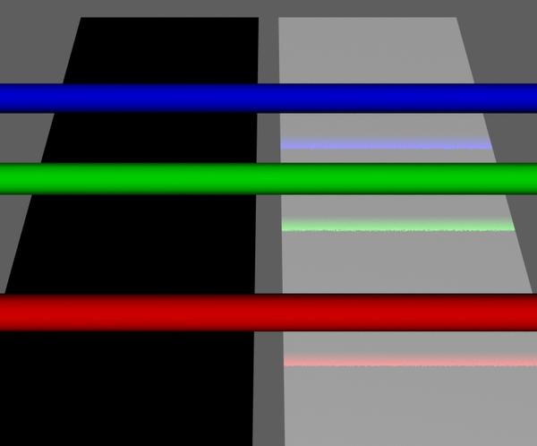 two plane primitives, three cylinder primitives. Raytraced reflections and 100% reflection strength on both planes, one plane has diffuse color set to white, the other to black. All other surface parameters on the planes are the same.