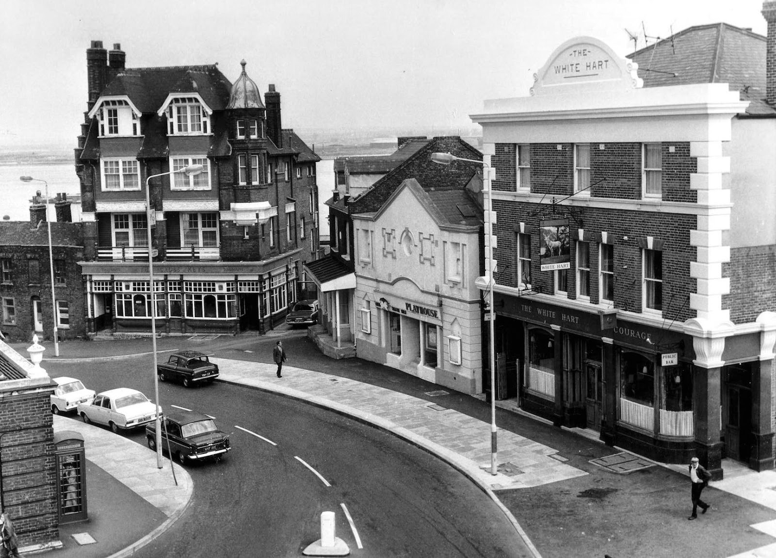 Here are 2 of them, either side of the local Playhouse. Photo taken a few years ago :-) as you can see by the cars, and working red phone box. They are both still there, but the White Hart has been empty for a while and looks a bit sad. The other is called the Cross Keys.