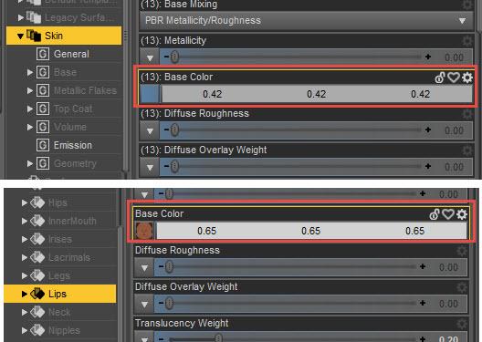 As for the skin color it's actually very easy to change, just change the Base color of the skin, lips and whatever parts you want to change. I've used some light greys here to retain the original color tone but you can also use colors to alter the color tone as well. See screenshots.