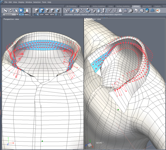Both front corners are a mess...there's overlapping faces and at least 1 extra face, folded in on itself. There's also a mismatch in the middle of the back of the collar (from the back centerline, it's the 4th to the left...)