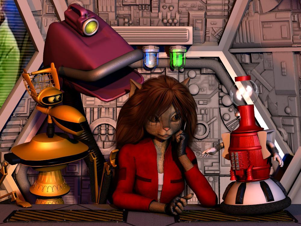 Great show and really cute render! Poor K'th! Stuck watching all those bad movies! lol It's fun seeing the MST3K crew hanging out with your OC. :)