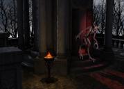I was thinking having some fog/mist dripping out of the chamber into the red light, or on either side of the steps, with some mist effects on the trees and background. I like the way the light and shadows turned out, so I don't necessarily want to cover them with fog. Perhaps some spooky magic effect on the demon itself. I was thinking Halloween here where the beastie gets loose.