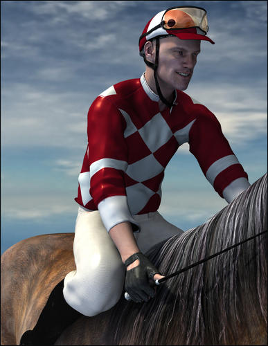 Jockey Set by SickeYield and I, also now owned by Daz. It comes with five sets of silks with matching jockey cap textures as well as pants, boots, goggles and whip.