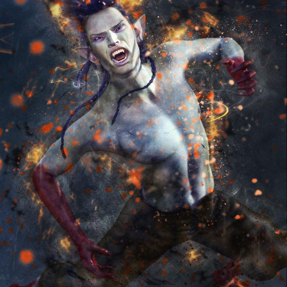Thanks everyone. I don't know who Namore the Sub-Mariner is... I just wanted to show both his claws and teeth along with his fantasy skin in my pose. He looks a bit like a demon with those added. Thinking demon led to thinking of hell, led to thinking of fire... so I just ran with an abstract idea of demon coming out of/or being thrown into hell. I'm not sure if that's what it looks like but that was my thought process. lol