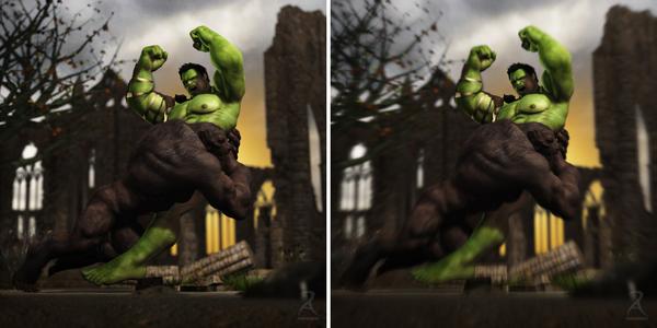 I noticed in a few of my Hulk graphic novels that they made use of of blurs to really give a sense of action...so that was the effect I was trying to emulate with the zoom-blur here.