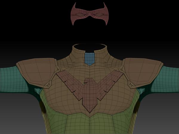 If I may suggest something: maybe echo the mask's shape in the pectoral logo and vise versa? Of course, the mask could do without a head and beak, I suppose, unless the head was aloft (bird-in-flight silhouette, dorsal view). Bring down the tail to end of nose/base of sternum...