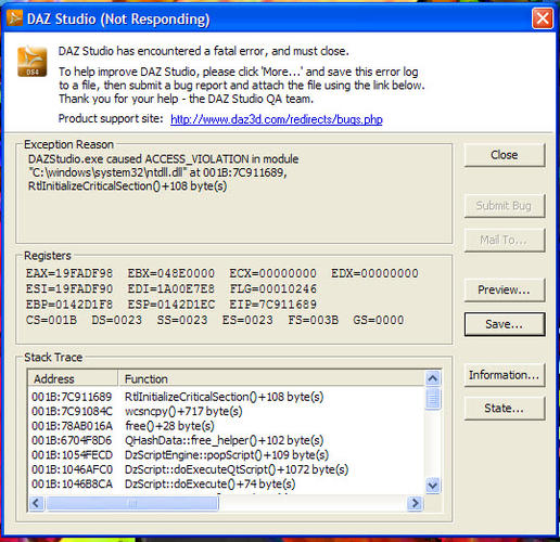 DAZ just crashes - works for a few second, but on the first click of any button and it crashes - when you go to save the error log it freezes - attached is all the details I can get off the screen.