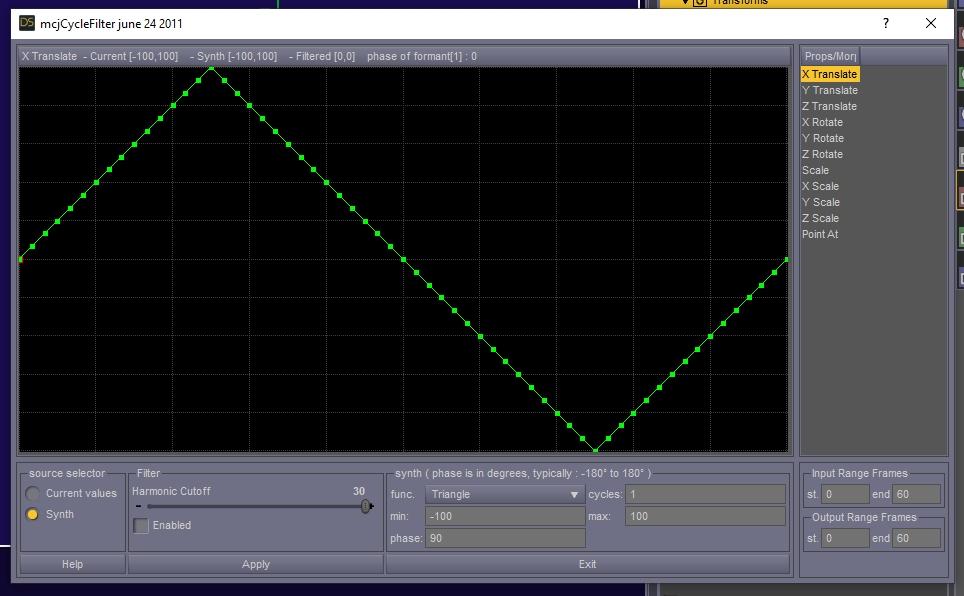 use mcjCycleFilter to apply a triangular animation curve to the sphere's xTranslate -100 to 100 phase = 90