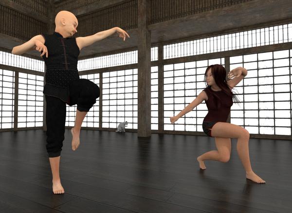 The dojo came from ShareCG, and the brick wall (part of a building) came from Blendswap.
