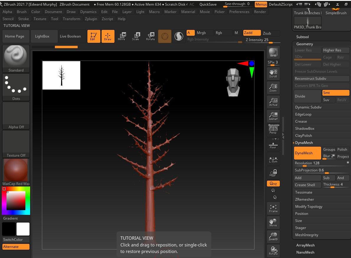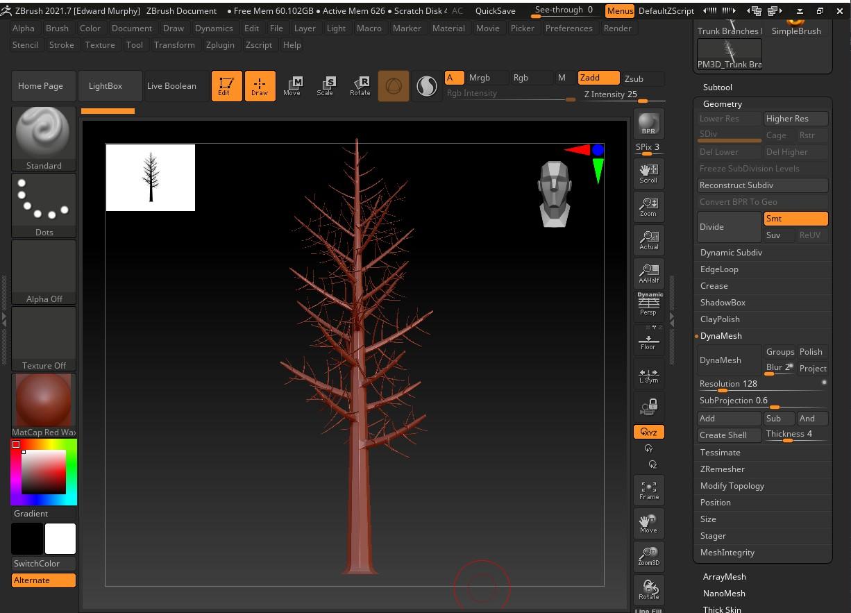 b) Start ZBrush.  Import the trunk/branches OBJ in the tool/subtool menu.  Click edit mode.  Make polymesh3d. Now, I can use the standard brushes except the results are not so good because the trunk/branches are low res.  Select the dynamesh menu intending to preserve shape but make sculptable.  Click dynamesh.  The trunk/branches too smoothes and the outer branches are lost.