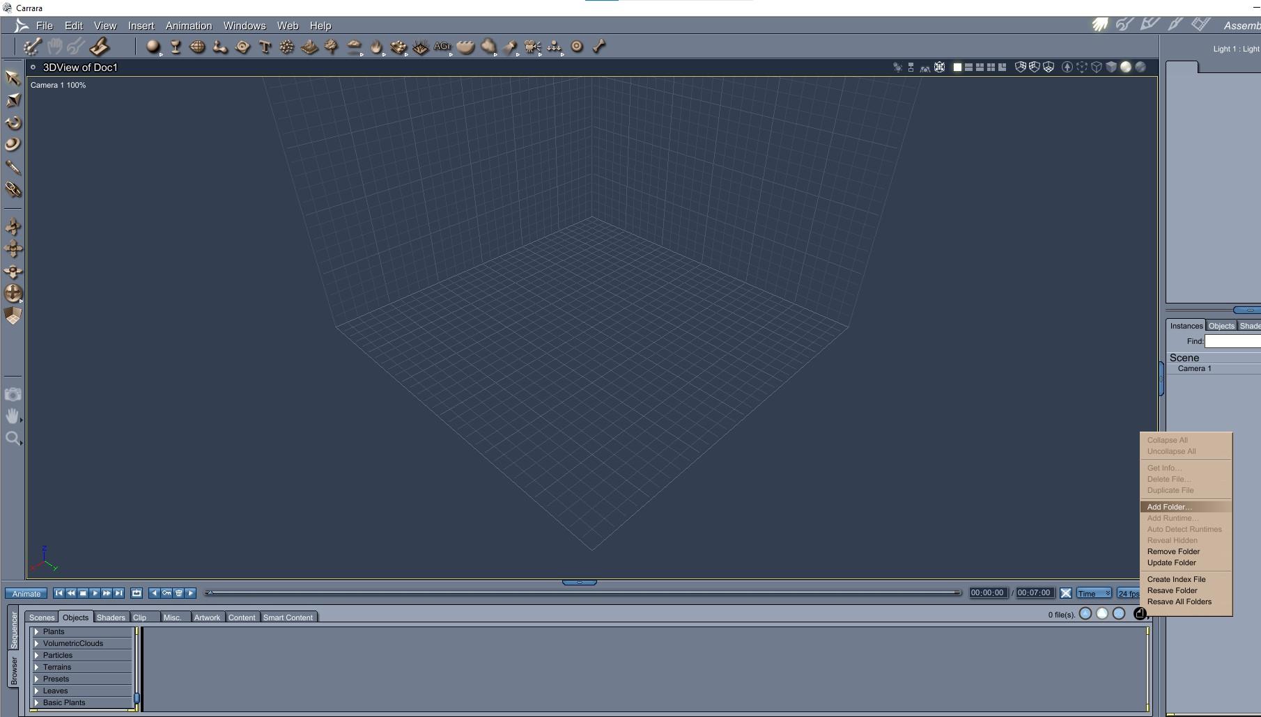 - Open the Carrara Browser Tray.  For each category (objects, shaders, clips,...), go to its tab to see the current folders.  In the upper right corner of the browser tray is an icon to add new folders.