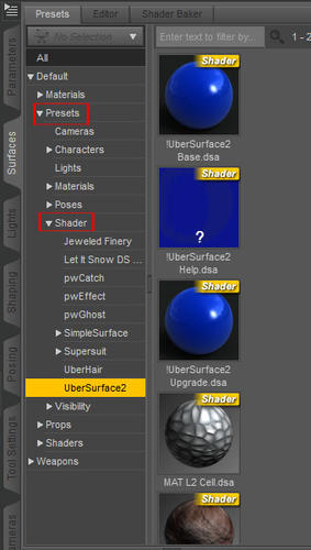 I had noticed with the last update 12700_UberSurface2DS4_1.3_ds the location, in the Surfaces Pane in Preset mode, changed positions appearing in Presets > Shader in DS4.5.1.6