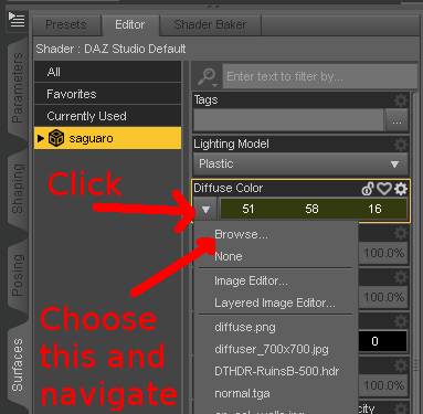 If, however, the material zones are there and showing under the Surfaces tab, then it is a matter of matching the various maps (diffuse, bump, specular, etc.) that you have to the correct surface. Hopefully the naming conventions used for the maps correspond to those used to name the surfaces, otherwise a bit of guesswork or trial-and-error may be involved. To apply the maps, simply open the Surfaces tab, click on the little square with the down arrow on the left side of the channel you wish to add (Diffuse, Bump, etc.), and choose Browse to go to the folder where the texture maps for the object are. Then, pick the right map for that channel and you should see it appear in the little square, and on your object. Repeat the process for each map and material zone, always selecting the correct maps for each zone. Of course, once all the maps are loaded, you will still need to adjust and tweak the actual surface settings to get the desired results. Lastly, save the results (export object), so that you won't need to go through it all again next time.