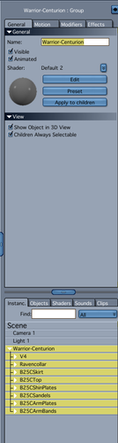 In the instance below, I had an outfit that I spent a lot of time fixing poke-through and I had parented an axe to the right hand and posed the fingers. I want to use the character again, so I grouped it together, named the group and dragged the top of the hierarchy (Warrior-Centurion) and dropped it into a folder in the Object Browser that I had previously created and added to the Browser.