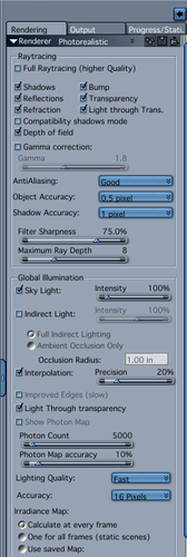 I forgot to mention this about the more advanced lighting models such as Skylight, Indirect Light Ambient Occlusion, etc. You'll need Light Through Transparency selected at the top of the Rendering options, as well as the one located in the Global Illumination settings. If it's not checked it can cause weirdness with the eyes or anything that has alphas or transparencies.