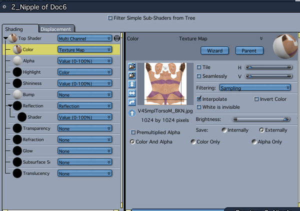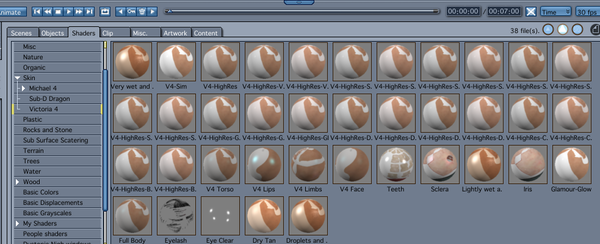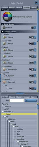 Another very useful post. Thanks. I made a document out of this post as well. I didn't know that about selecting the model then clicking on the shaders tab or about that 'overall' shader. Will doing it that way also affect the eyes and such or is it smart enough to only do the skin? Your way is definitely faster. I was going region by region applying the shaders. I've got a render running now that combines some of the stuff from this thread and the other one. I'll post it here when it finishes and hopefully get some feedback. :)