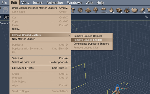 Carrara likes to hold onto master shaders. To reduce system overhead and improve performance, go to the Edit Menu-->Remove Unused Masters-->select Remove Unused Shaders. You may also wish to select Consolidate Duplicate Shaders. Then remove Unused Shaders again. This can also reduce the size of the saved scene file.