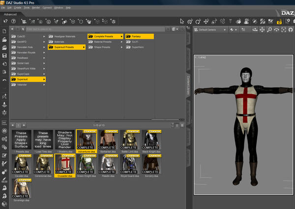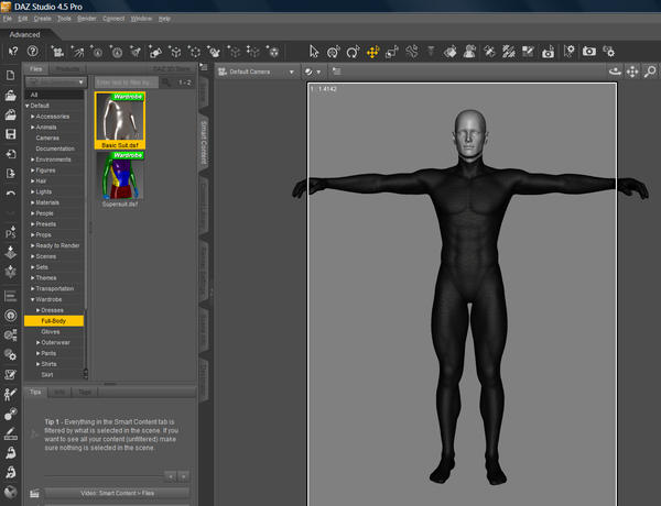 First, the SuperSuit product comes with two different suits. The primary SuperSuit, and the BasicSuit. The BasicSuit is REALLY basic; most of the time you'll want to use the primary suit, as that's where the real value in the product is. The primary suit has hundreds of morphs in it to modify the suit shape.