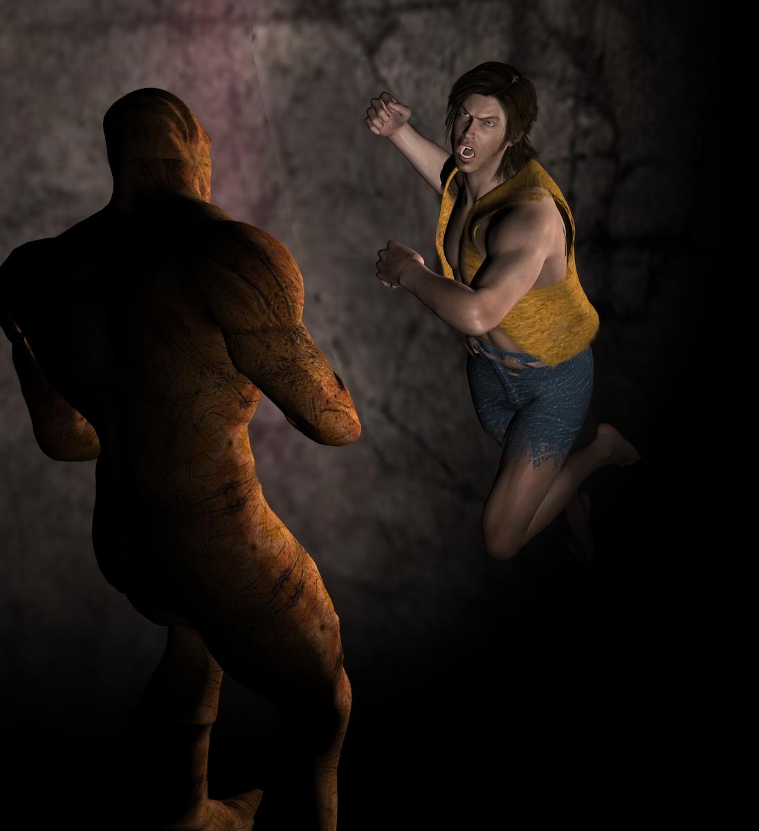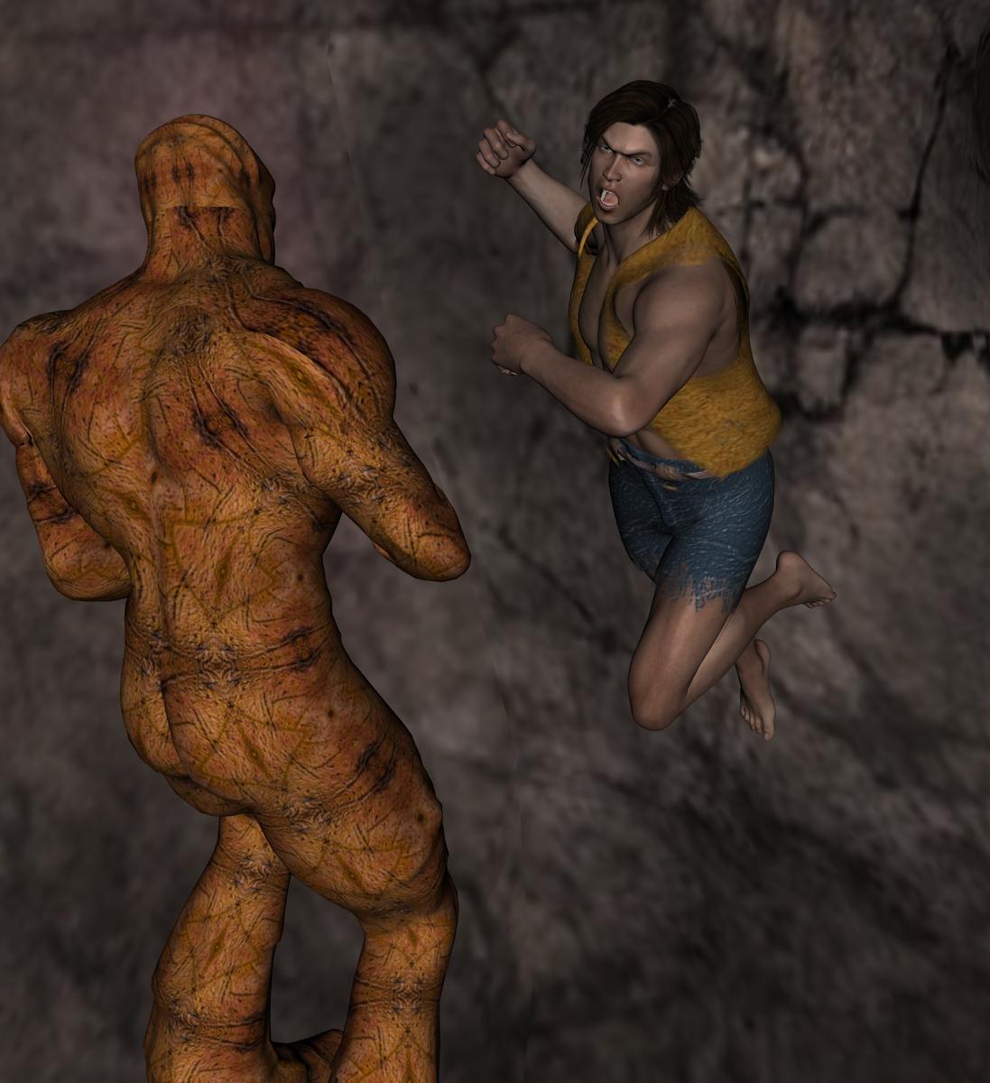 Aaargh. Shouldn't have procrastinated. Here, I managed to change the skin surface of the elemental, and the material for the pants. I also managed to change the camera angle and the aspect ratio of the render, which turned out to be quite a chore. I coudn't figure out why the width seemed to be locked, LOL. Eventually managed it. Never did figure out how to do the lights before I ran out of time. Oh, well, hope to improve more next month. Appreciate the help.