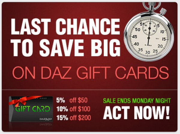 Quick reminder that today's the last day for 5-15% off on DAZ gift cards -- if you can get a $200 one for yourself before midnight DAZ-time, this means that everything you buy with it has effectively been pre-dicounted 15%, no matter whose it is or what other sales it's on. :coolsmile: