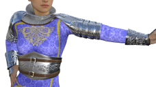 The armor starts by applying the Iray default Iron shader, then using the material's specular map as the diff map. Then put the displacement back in, match the original displacement settings, and turn SubD to 5 on the shoulder, 4 on the waist and main part of the gauntlet, and 3 on the lower pauldron and hand guard.