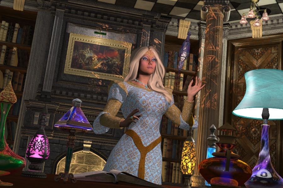 I added spotlights on the floating vial to brighten it, then turned down both the fireplace and the wall lighting on the right. I tried it with Depth of Field, but didn't like the results - I wasn't able to focus it so that only the background was blurred - the foreground objects were blurred as well. So this render doesn't have the depth of field. I think the reduction in lighting on the bookshelf helps push it into the background. I may try to blur the background slightly in Photoshop instead.