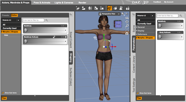 Question: And finally, I'm completely lost in the main screen with Parameters and Morphs and such. It appears to me that things are missing. And I have already selected the entire body, yet the only morphs I can do are on the Head and Male Body. Where did all the other body morph options go? I just want to give her more feminine proportions.