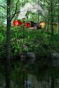 Like I said back then, The main background is one of Howie Farkes's Cararra sets (Maple Meadows, I think). I just opend it and pointed a camera at it and rendered it in its defaults. The train is a Western Train set from a site caled poseAtier, rendered in Studio. Everything patched and spliced together in Photoshop.