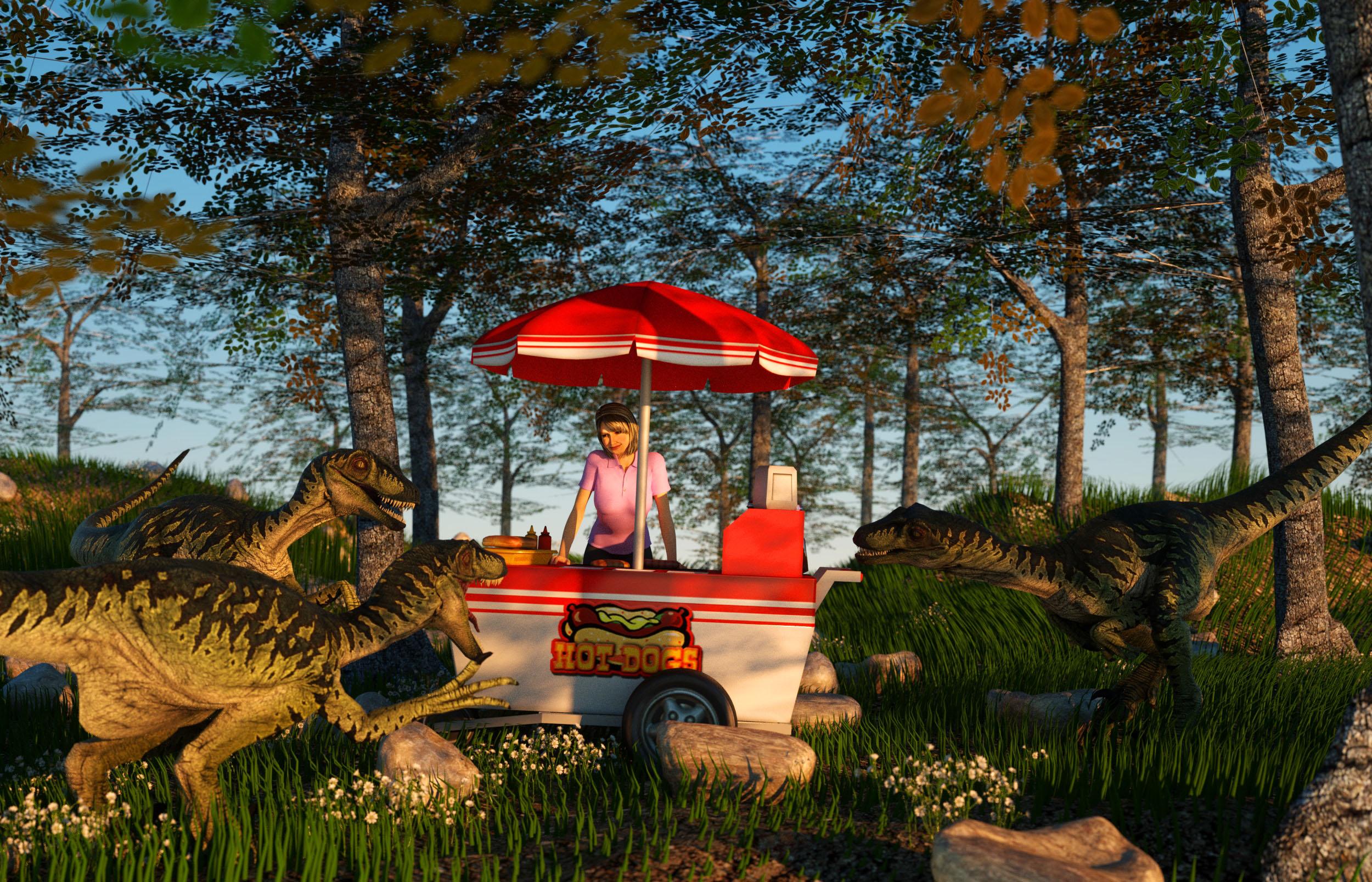 -  It can be a fantasy scene in which people with cadillacs and machine guns confront dinosaurs.