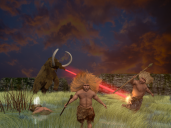 ​Other Context and Comments (including credits):  PhilW's Adrea Hair,  Diomede's help with mammoth rigging,  Evilproducer's Campfire freebie re-constructed to fit a$$ afire,  and made the beam with a cylinder + glow + aura, created cliffs with terrain tool.