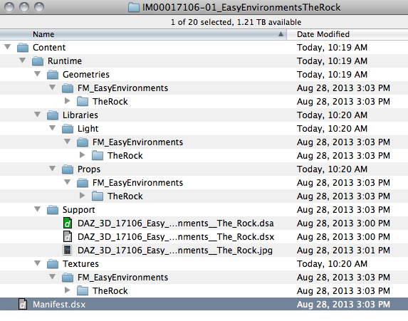 Here's what's in the .zip file, which is as far as I needed to dig. I didn't need to get inside any of the folders of the individual product, just dragged the folders into the various FM_EasyEnvironments folders, where they already were in the Runtime folder.