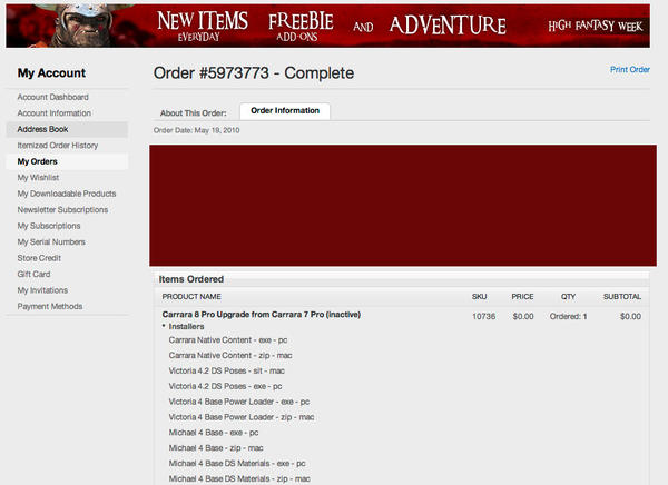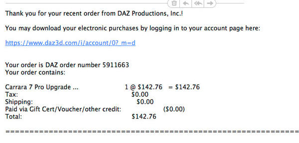 It looks like I purchased the Carrara 6 Pro to Carrara 7 Pro Upgrade on April 28, 2010. I believe they said that if I purchased it at that time that I would get a free complimentary upgrade to Version 8 Pro when released.