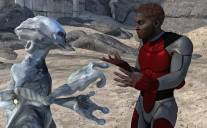 So now I'm rendering a scene of a black guy in a spacesuit haggling with an alien.
