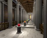 Vivien- Nice step forward with the columns image. Smart choice to warm up the colors of the light, it has improved the mood. The vegetation is better too. There is a difference between transparency and translucency. Translucency is the effect you would have actually wanted here, but I think that transparency can be better than nothing at all so go for it. Shortly I'll try to make some translucent leaf materials available. The render time is similar to transparency, so I'm sure you can afford the translucency when the time comes.