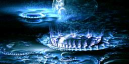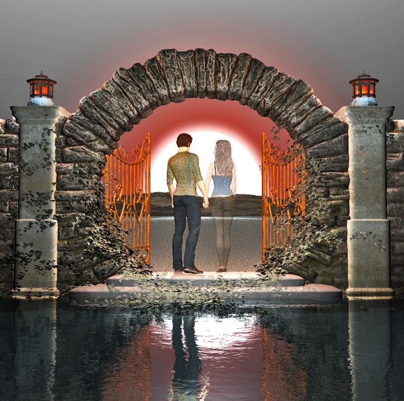 As to the ghost effect, Mermaid, I just put a green screen behind the girl on her own (you know how they do in the movies), and from there layered her, chromo-keyered her into the rest of the scene (guy, moongate, water etc.,) using a separate software. I did try to make her transparent in Bryce, but maps for the girl turned out weird.